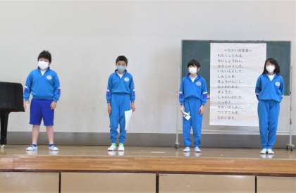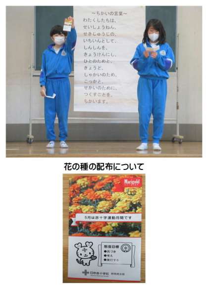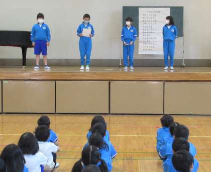 5月10日(水) 緑の少年団結団式 公開日 2023/05/10 更新日 2023/05/10 できごと JRC登録式に続いて、「緑の少年団結団式」を行いました。5・6年の学級委員より、緑の少年団の説明や、これからの活動(クリーン作戦、花の種の配布、花いっぱい運動)について話がありました。今日、子どもたちが花の種を持ち帰ります。保護者の皆様、ぜひご家庭でお子さんと一緒に種をまいて開花を楽しんでみてください。
