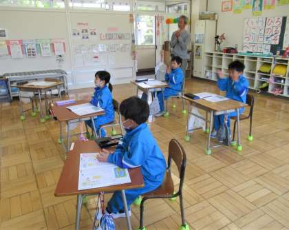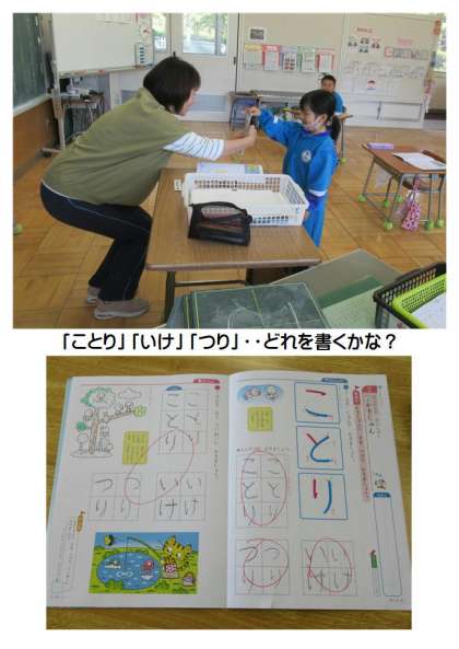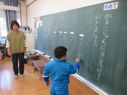 1年生の書写の今日の「めあて」は、「書き順に気をつけて書きましょう」です。「ことり」「いけ」「つり」の3つの言葉を練習したあと、みんなで黒板に出て、正しい書き順で書けるかどうか挑戦しました。書く言葉は、くじを引いて決まります。友だちが正しい書き順で書けると、みんなで拍手をして讃え合いました。5人が一回りしたあと、子どもたちから「もう1回やりたい!」とリクエストが出て、2回目に挑戦しました。子どもたちが楽しそうに主体的に学習に取り組んでいました。