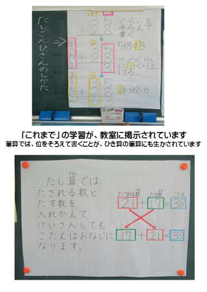 2年生の算数では、「いろいろなひきざんの筆算の仕方」について考えていました(めあて)。「これまで」学習したたし算の筆算の仕方(位をそろえて書く)が今日の学びにつながっています。