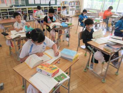 4年生の国語では、新しい学習単元「アップとルーズで伝える」に入りました。今日は、このあとの読み取りに向けて、わからない言葉の意味調べをしていました。国語辞典が大活躍していました。