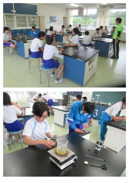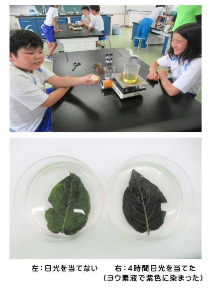 5月12日(金) 6年生の理科 公開日 2023/05/12 更新日 2023/05/12 できごと 6年生の理科では、まとめ「植物の葉に日光が当たると、葉にデンプン(養分)ができる。葉にできた養分は、植物の成長に使われる」ことを、実験を通して学びました。日光を当てた葉と当てない葉の比較で、一目瞭然の実験結果でした。