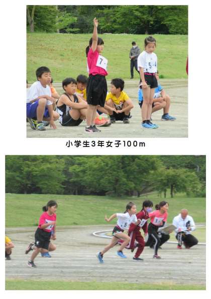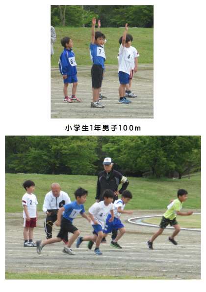 小学生1年男子100mに1名(写真上2枚)、小学生3年女子100mに1名(写真下2枚)が出場しました。ゼッケン「7−〇」が本校児童です。スタートからゴールまで全力で走り抜きました。