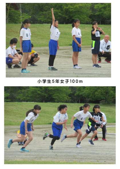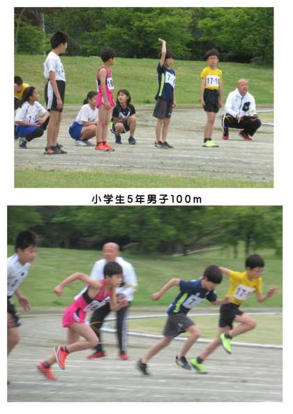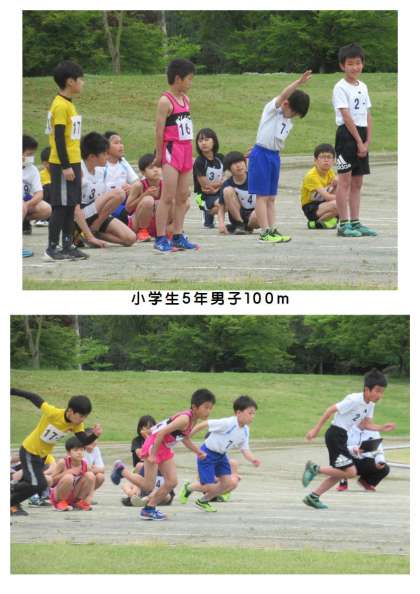 5月14日(日) 藤岡市民陸上競技大会(2) 公開日 2023/05/14 更新日 2023/05/14 できごと 小学生5年男子100mに2名(写真上から4枚)、小学生5年女子100mに1名(写真下2枚)が出場しました。ゼッケン「7−〇」が本校児童です。スタート地点ではお互いに応援し合い、ゴールまで全力疾走でした。