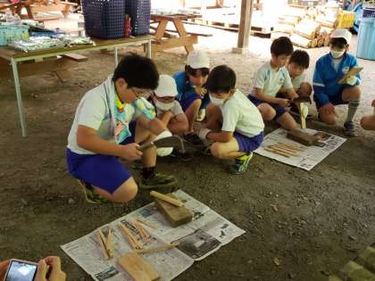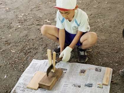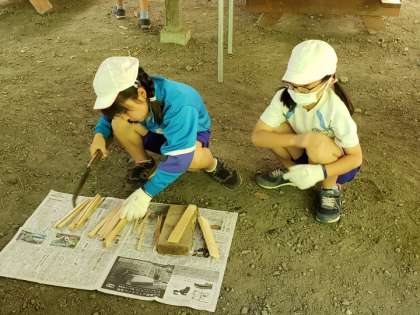 薪割りに挑戦です。みんな話をしっかり聞いて、割りばしサイズの細さに挑戦しました。慎重に取り組み、みんな上手です。