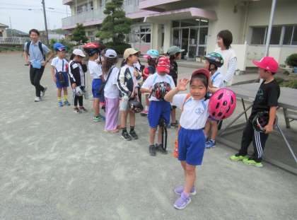 3年生が、かぶら自動車教習所へ「自転車安全教室」に出かけました。一人一人自分のヘルメットを持っています。みんなが「合格証」をもらえますように。