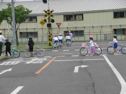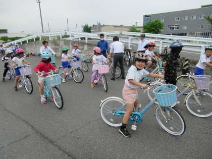 次に、自転車の危険について学び、実際に自転車の乗り方を学ぶ自転車実習が始まりました。子どもたちは自転車にまたがっただけでウキウキした表情をしていました。