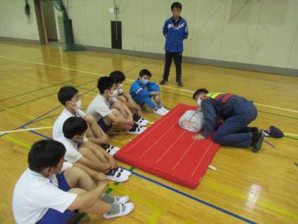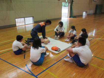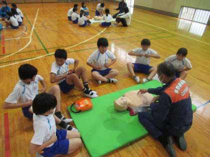 5月19日(金) 救急救命法講習会(2) 公開日 2023/05/19 更新日 2023/05/19 できごと 5つのグループに分かれ、実習が始まりました。 人が倒れていた場合の意識や呼吸の確認の仕方、胸骨圧迫のやり方などを学びました。児童たちも真剣な眼差しで講師の方のお話を聞いていました。