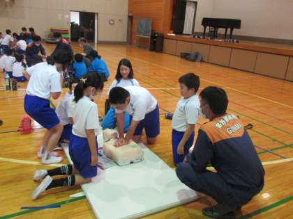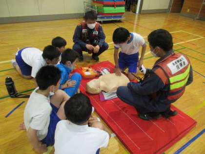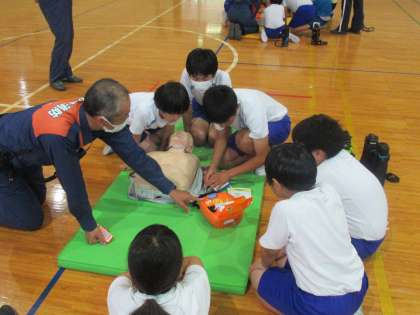 5月19日(金) 救急救命法講習会(4) 公開日 2023/05/19 更新日 2023/05/20 できごと つづいて、AED(自動体外式除細動器)の仕組みや使い方について教えていただきました。AEDを初めて操作するという子もたくさんおり、改めて「知っておくことの重要性」を感じました。