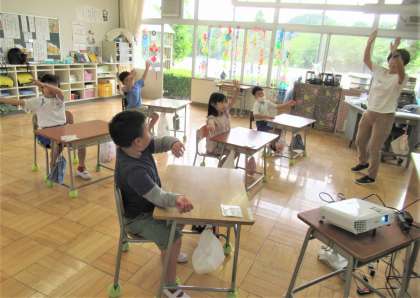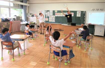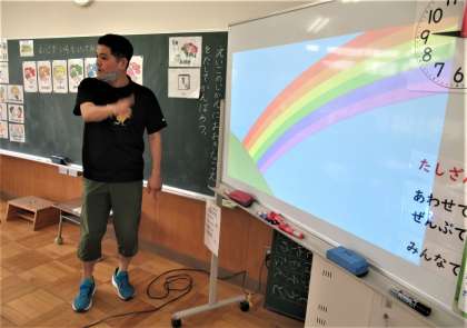 6月1日(木) 1年生の外国語活動 公開日 2023/06/01 更新日 2023/06/01 できごと 1年生の外国語活動では、ALT(外国語指導助手)と担任の先生と一緒に、めあて「いろいろな色を英語で言ってみよう」の学習に取り組んでいました。動画「The Rainbow Song(レインボー・ソング)」に合わせて、振りをつけながら楽しく、7色の色が出てくる英語の歌を歌っていました。