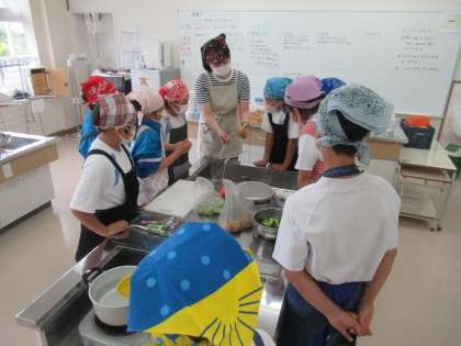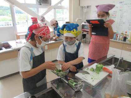 5年生の家庭科の授業では、調理実習をしていました。今日は、「ゆで野菜サラダを作ろう」というめあてで学習していました。この時は、野菜を切ったり、皮をむいたりする調理工程の学習をしていました。