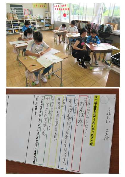 6月5日(月) 2年生の国語 公開日 2023/06/05 更新日 2023/06/05 できごと 2年生の国語では、『うれしいことば』について学習していました。これまで言ってもらってうれしかったことばをふり返り、ワークシートに書き出しました。「このあとは」ワークシートに書き出したことをまとめて作文します。