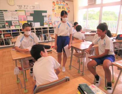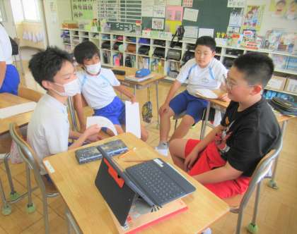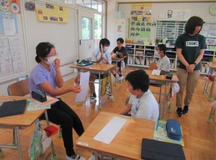 6年生の国語では、自分がつくった短歌を友だちと詠み合って、よいところを伝え合っていました。友だちの短歌のよさを味わい、楽しそうに学習に取り組んでいました。