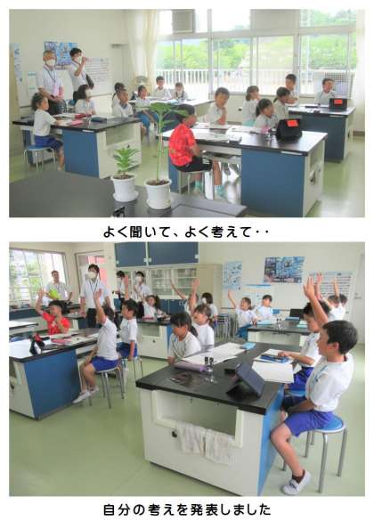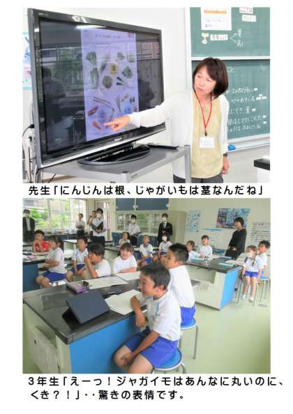 6月6日(火) 3年生の理科(計画訪問) 公開日 2023/06/07 更新日 2023/06/07 できごと 3年生の理科では、めあて「植物の体は、どのような部分からできているでしょうか」の授業でした。ホウセンカとヒマワリを観察して、気付きがたくさんありました。最後に、先生から、日常生活で食べている野菜にも植物として同じ体のつくりがあることを聞き、子どもたちは「えーっ!ジャガイモはあんなに丸いのにくきなの?」などと驚きの表情いっぱいでした。身の回りの植物への関心が高まったようです。