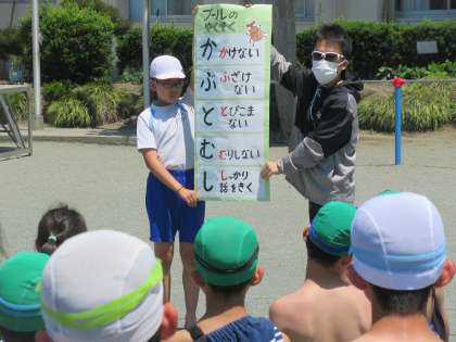 まず、校庭に整列し、体育主任の先生からプール実習での注意点のおはなしを聞きました。教務主任の先生が作ってくれた掲示物を見ながら全員で確認しました。