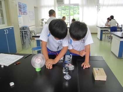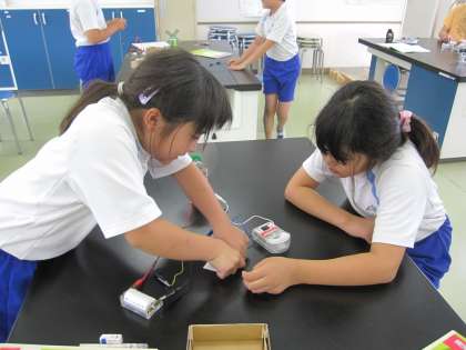 かん電池のつなぎ方と電流の大きさの関係を調べました。