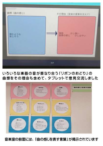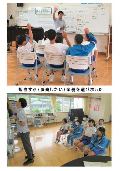 6月14日(水) 5年生の音楽 公開日 2023/06/14 更新日 2023/06/14 できごと 5年生の音楽では、めあて「『リボンのおどり』の曲想を感じ取り、伝え合おう」の学習に取り組んでいました。理由も含めて曲想を伝え合ったあとは、どんな楽器が使われているかを考えました。このあとは、それぞれの楽器を担当し、いろいろな楽器の音の重なり合うひびきを楽しみながら演奏します。5年生の合奏が楽しみです。