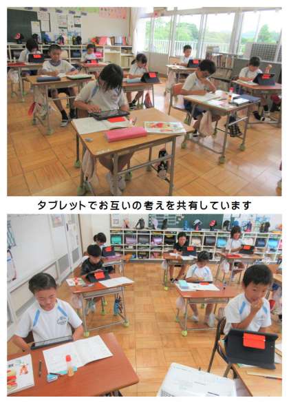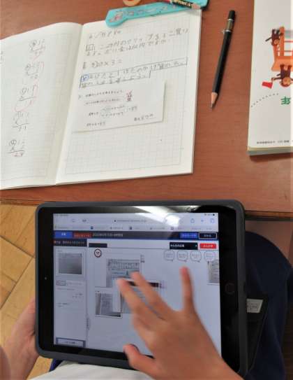 3年生の算数では、「2けたと1けたのかけ算の筆算の仕方」について考えていました。まずノートに自分の考えを書き、それをタブレットで写真に撮って、友だちとお互いの意見を共有しました。ノートとタブレットが効果的に使われています。
