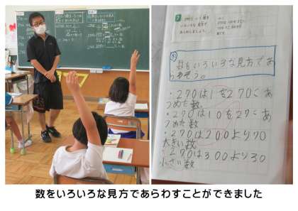 6月19日(月) 2年生の算数 公開日 2023/06/19 更新日 2023/06/19 できごと 今日の2年生の算数では、5・6年の算数を担当している先生が、ゲスト・ティーチャーとして授業を行っていました。子どもたちは、多少緊張感をもちながらも、今日のめあて「数をいろいろな見方であらわそう」に向けて、たくさん意見を発表していました。