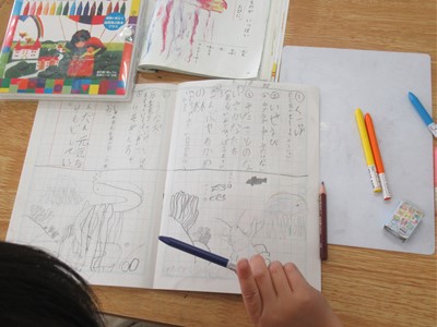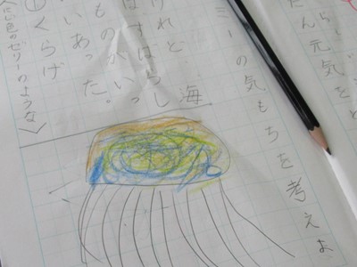 今日は、「スイミーの気持ちを考えよう」というめあてで学習していました。文章の中に出てくるさまざまな比喩表現(例えの表現)を読んで、自分の頭の中に浮かんだ映像を絵に表現していました。