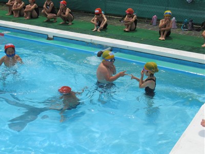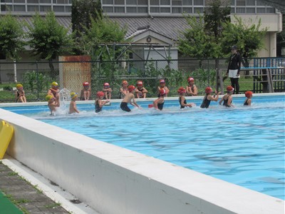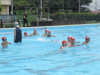 今日は水なれをした後、プールの中を走ったり、水中ジャンケンなどをしたりしていました。