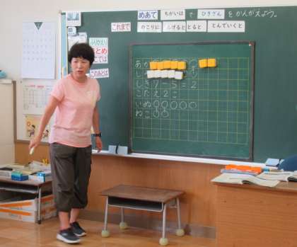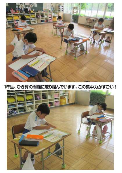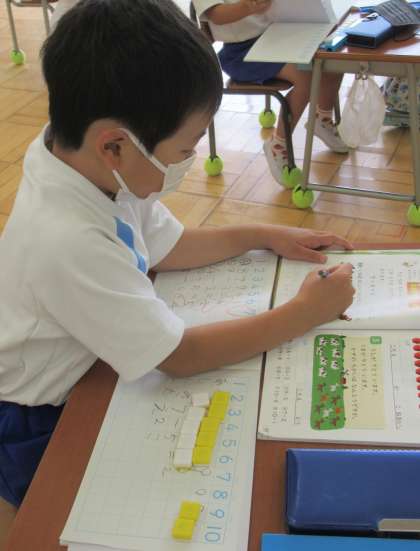 6月21日(水) 1年生の算数 公開日 2023/06/22 更新日 2023/06/22 できごと 1年生の算数では、ひき算の文章問題に取り組んでいました。これまでに学習したひき算のキーワード「のこりは」「あげると」「とると」「とんでいくと」に加えて、本時では「ちがいは」というひき算のキーワードを新たに学習しました。式を立てて、ブロックを操作して確かめて、答えを出していました。1年生の問題に取り組む集中力がすごいです。