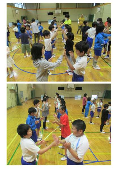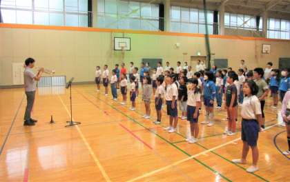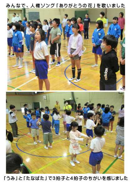 6月22日(木) 音楽集会(1) 公開日 2023/06/22 更新日 2023/06/22 できごと 今日の業前活動は「音楽集会」を行いました。はじめに、音楽主任の先生のトランペット演奏で、全校のみんなで人権ソング「ありがとうの花」を歌いました。次に、「うみ」と「たなばた」の歌で、3拍子と4拍子のちがいを体感するリズム遊びを行いました。「笑顔いっぱい」楽しそうです。