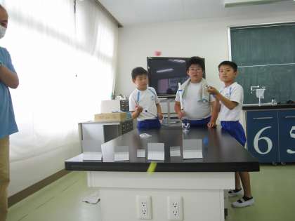 6月23日(金)4年理科 とじこめた空気や水(その4) 公開日 2023/06/23 更新日 2023/06/23 できごと 子ども達は、何度か繰り返しているうちに、つつの中の空気の体積が多い方が玉が勢いよく飛ぶことに気付きました。空気でっぽうは、つつの中の空気が押し縮められて前玉を押すことによって玉が飛ぶことがわかりました。