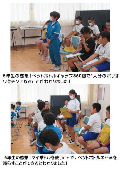 子どもたちは、話を聞く中で、自分が、自分たちが行っている行動(ペットボトルキャップの回収、古紙回収、食べ残しをしない、水筒を使う、エコバッグを使う、等々)が、SDGsの活動につながっていることを実感したようです。今日、学んだことがこれからの子どもたちのSDGsに向けた行動にさらにつながっていくことでしょう。ぜひ、ご家庭でもSDGsについて話題にしてみてください。