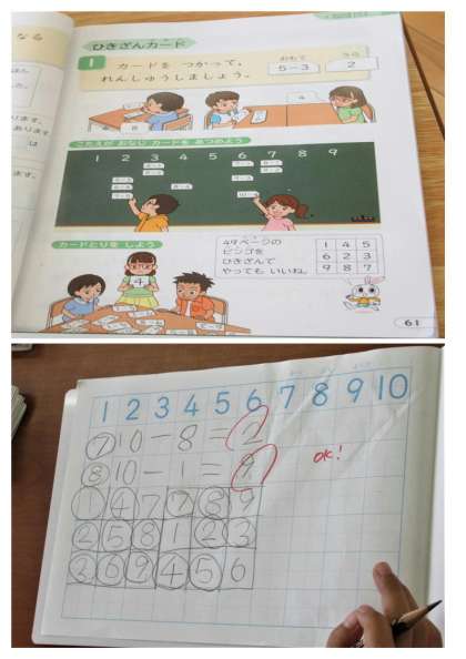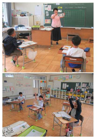 1年生の教室から、「やったぁ、ビンゴ!」と楽しそうな声が聞こえてきました。算数の時間に、ひきざんビンゴをして楽しく学習していました。先生が提示するひきざんカードを見て、すばやく答えを出していました。楽しみながら勉強できるなんて、1年生すごいです!