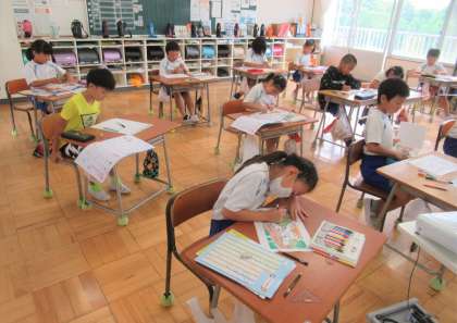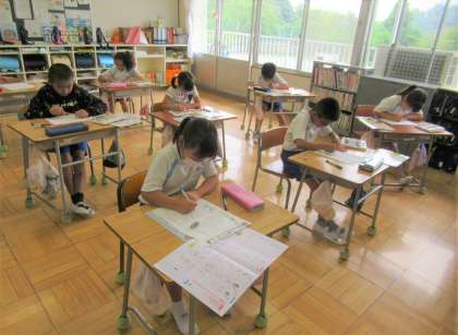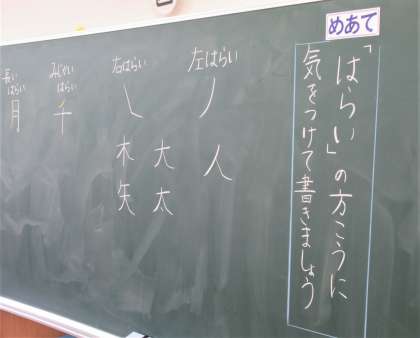 3年生の書写の今日のめあては「はらいの方向に気を付けて書きましょう」です。子どもたちは、集中して書き方ノートに取り組んでいました。