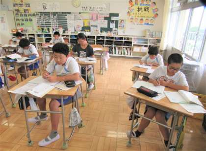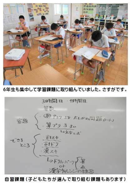 6月26日(月) 6年生の自習の様子 公開日 2023/06/26 更新日 2023/06/26 できごと 東連携型小中一貫校合同研修(東中研究授業参観)のため、3〜4校時にかけて自習となった6年生教室では、子どもたちが黙々とそれぞれ学習課題に取り組んでいました。担任の先生がいなくても、集中して学習に取り組むことができる6年生の姿に「さすが6年生!」と頼もしさを感じました。こうした自習時間を大事にして学習に取り組むことができる姿は、中学校生活へとつながっていきます。