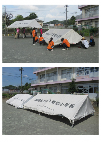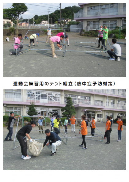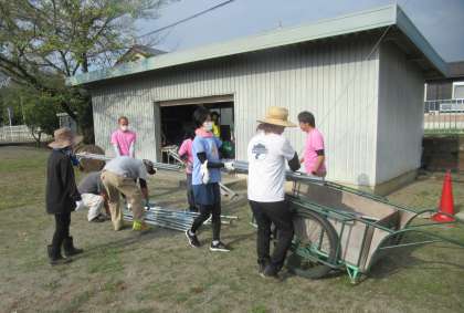 本日、PTA環境整備作業が行われました。まず7時半に本部役員・環境研修委員・職員が集合し、打合せ・準備の後、運動会練習時に子どもたちの休憩場所として使うテントを2張り組み立てました。
