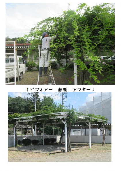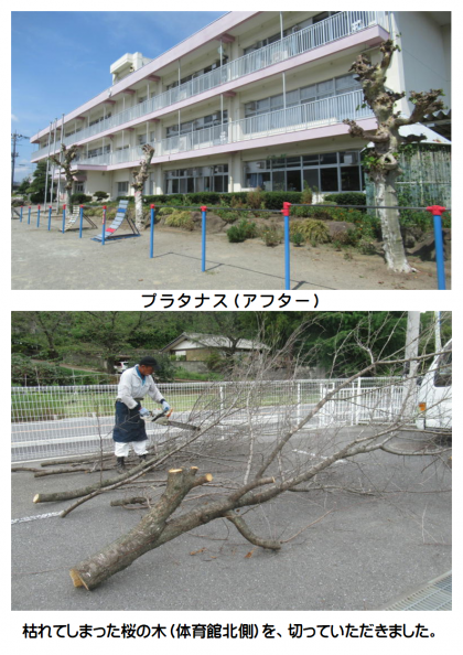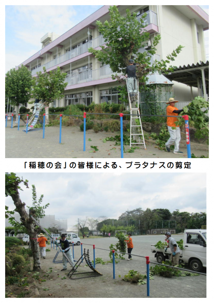 PTA環境整備作業には、毎年、地域の「稲穂の会」の皆様にもご協力いただいています。今年度も、プラタナスや藤棚の剪定、桜の木の伐採をしていただきました。ありがとうございました。