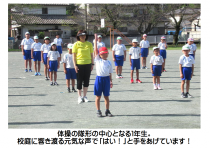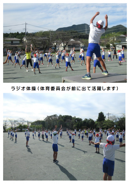 9月7日(木) 体育集会 公開日 2023/09/07 更新日 2023/09/07 できごと 今日は、ラジオ体操と退場の動きを確認しました。体育委員長の「体操の隊形にひらけ!」の号令とともに、隊形の中心となる1年生が、校庭に響き渡る元気な声で「はい!」と手をあげ、全校のみんなで「1・2・3!」のかけ声でかけだします。元気な声とすばやい動きで、今日も先生たちからたくさんほめられました。みんなすごいです!