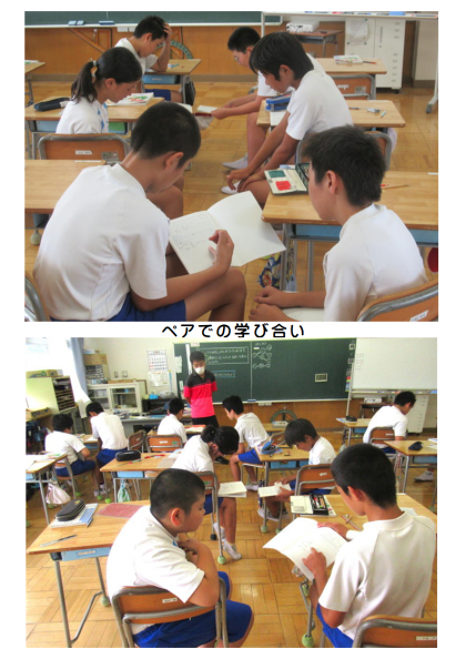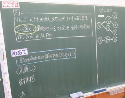 9月7日(木) 6年生の算数 公開日 2023/09/07 更新日 2023/09/07 できごと 6年生の算数では、組み合わせの調べ方を樹形図を使って考えていました。ペアになって説明し合ったり、全体で説明し合ったりして、学びを進めていました。考えを相手に伝える活動をとおして、学習内容の理解が進みます。