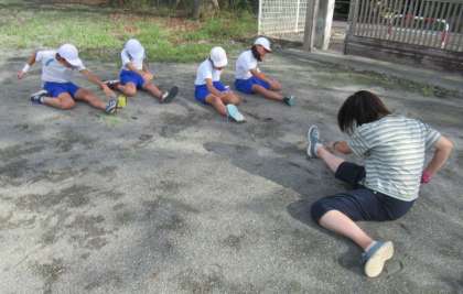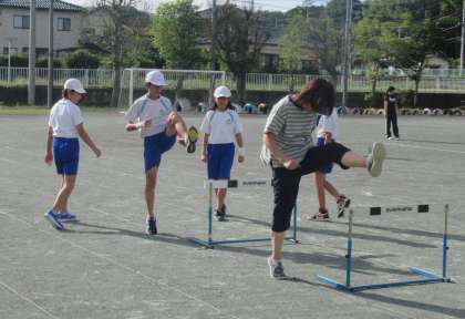 50mハードル走の練習の様子です。ハードル走の準備運動をして、ハードルの跳び方を確認し、実際に跳んでみました。