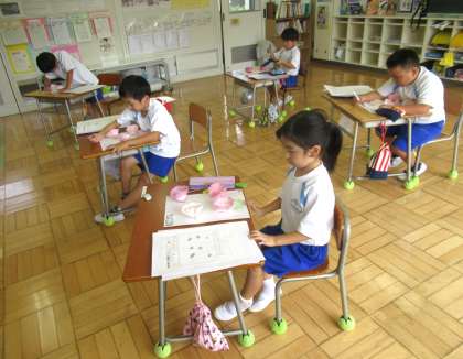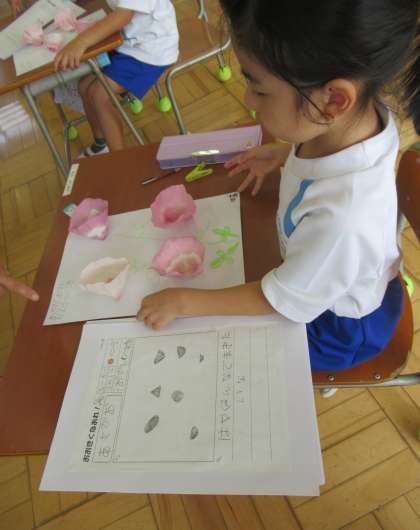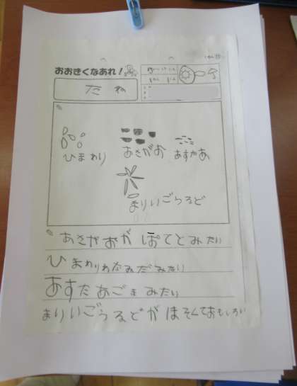 9月11日(月) 1年生の生活科 公開日 2023/09/11 更新日 2023/09/11 できごと 1年生の生活科では、1学期に書きためてきた「アサガオの観察日記」を1冊にまとめていました。表紙は、コーヒーフィルターにアサガオの染め出しをして作った立体的な「クラフト・アサガオ」で飾られています。観察日記の1枚1枚には、1年生が習ったばかりのひらがなで書いた文と、よく観察して描いた絵がかかれています。1年生の一生懸命さと学習の軌跡がわかる「アサガオ観察日記」です。