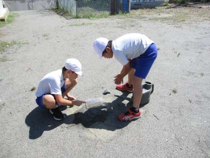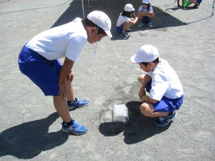 9月13日(水)4年理科 雨水のゆくえ(その2) 公開日 2023/09/13 更新日 2023/09/13 できごと 地面にふせた入れものの内側に水がついたことから、地面からもじょう発していることがわかりました。