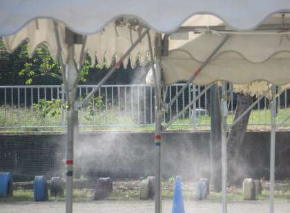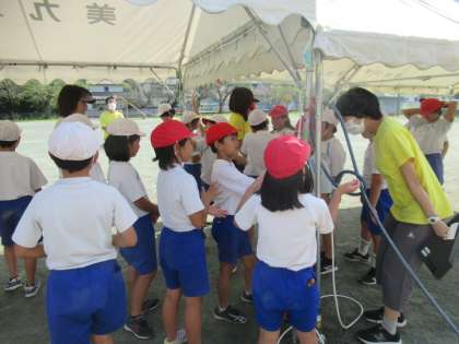 運動会練習等の暑さ対策のために設置したテントに、教頭先生と事務の先生が、「ミストシャワー」を取り付けてくれました。運動会練習に励んでいる子どもたちが、休憩時に涼しさを味わうことができます。