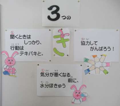 (写真上)9月5日の運動会結団式で体育主任より、「3つの『き』」について話がありました。子どもたちは、この「3つの『き』」を意識して、毎日練習に取り組んでいます。