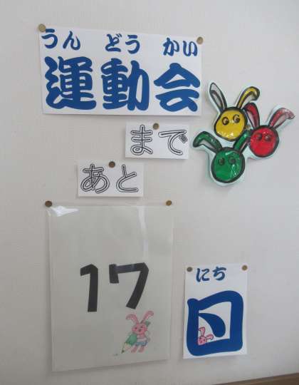 (写真下)児童玄関に、「運動会まであと○日」のカウントダウン掲示物が貼られています。子どもたちの士気が日に日に高まっていきます。