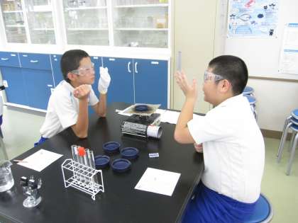次に、水溶液を蒸発皿に少量とって熱し、何か残るか調べました。