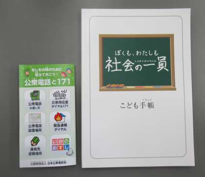 9月15日(金)、公益財団法人 日本公衆電話会より、1・2年生を対象に、こども手帳「ぼくも わたしも 社会の一員」をいただきました。災害時の対応として、連絡先や避難場所を書いておいたり、災害用伝言ダイヤル171についての情報も掲載されています。もしもの時に備えて、ご家庭でぜひご覧になってみてください。