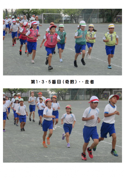 9月20日(水) 全員リレーの練習 公開日 2023/09/20 更新日 2023/09/20 できごと 今日は、運動会最後の種目「団対抗全員リレー」の入退場を確認しました。1・2年生は、何番目を走るかわかりやすいように、走順の番号が書かれたビブスを着て走ります。今日は、全員で軽く半周を走って確認しました。本番は、各団一丸となって全力でゴールまでバトンをつなぎます。応援よろしくお願いします。