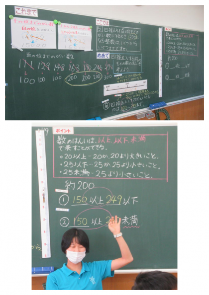 4年生の算数では、数の範囲を表す「以上、以下、未満」について学習していました。授業後半の「振り返り」では、今日の学習のポイントをもとに、教科書の問題に取り組みました。子どもたちのノートには、「葉っぱつきのニコニコ花丸」が描かれました。
