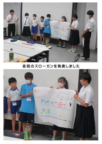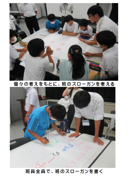 班別協議では、藤岡工業高等学校の生徒さんが司会を務め、一人一人の意見を出し合い尊重し合いながら、熱心な話合いが行われました。最後に、全体で、各班のスローガンを発表し合い共有しました。