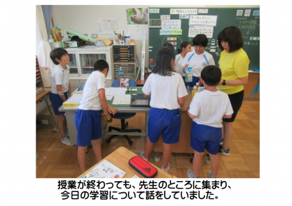 授業が終わったあとも、先生の周りに集まって、今日の学習について話をする子どもたちの姿に、今日の授業が子どもたちにとって「学ぶ楽しさ分かる授業」であったことが伝わってきました。
