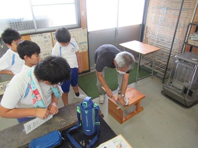 9月22日(金) 4年生の図工 公開日 2023/09/22 更新日 2023/09/22 できごと 4年生の図工では、「のこぎりで木を切ろう」という学習をしていました。のこぎりを使うのは初めてという児童が多く、先生にお手本を見せてもらってから各自で練習しました。このあとは、のこぎりを使って作品作りをするそうです。