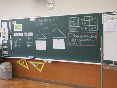 今日の授業では、三角形は3本の「へん」と3つの「ちょう点」、四角形は4本の「へん」と4つの「ちょう点」をもつ図形だということを学びました。
