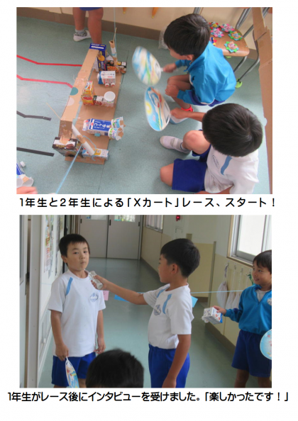 今日は、1年生や職員室の先生たちが「あきまつり」に招待されました。あいさつをした後、さっそく「あそびコーナー」で楽しみました。